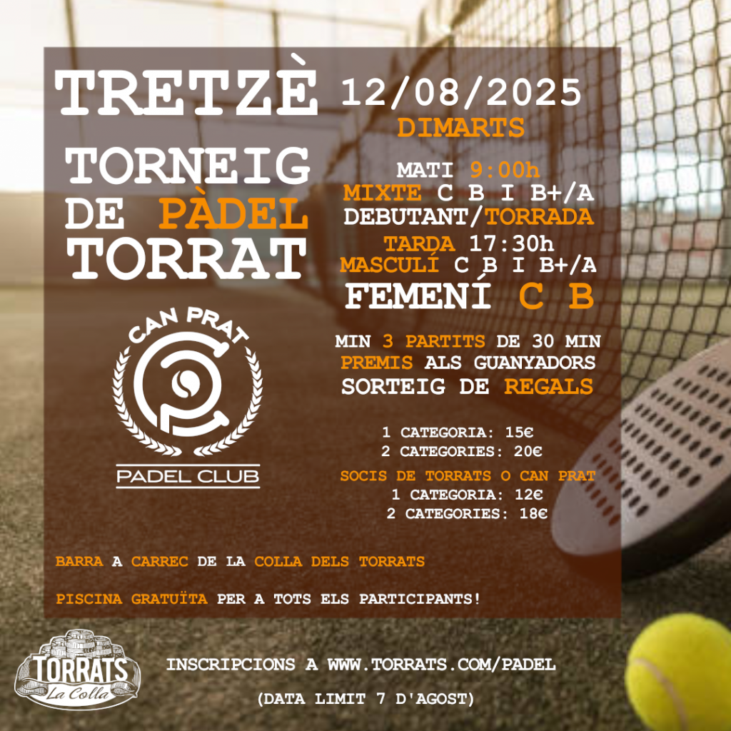 El dimarts 12 d’Agost torna el tradicional torneig de Pàdel de Festa Major a Can Prat Pàdel Club!